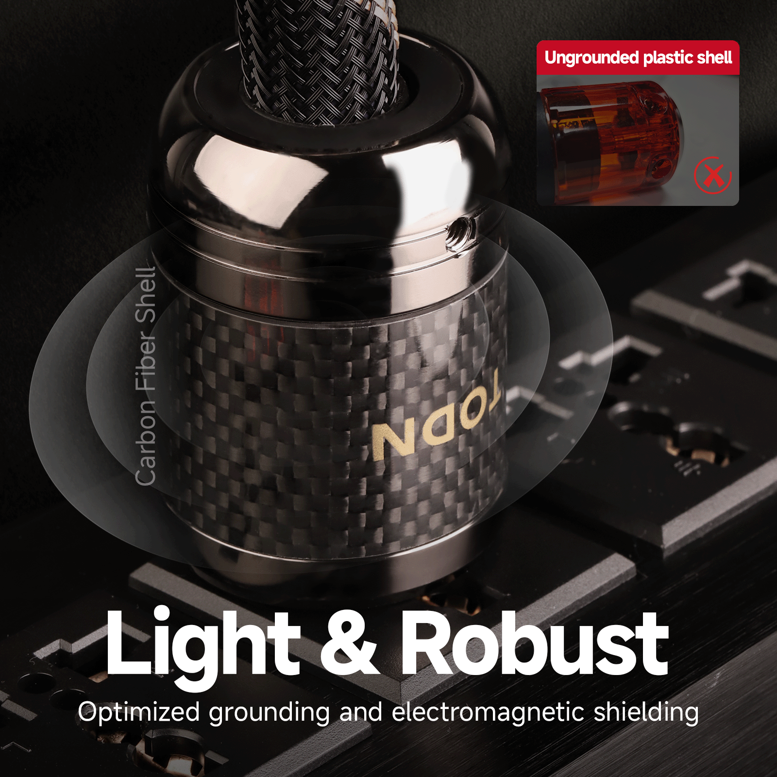 Stronger and More Rugged: With a 17.5 mm diameter, 3ft (1 meter) length, and 1.28 pounds (580g) weight, this power cable feels sturdy. It features a high density OCC copper braided shielding that minimizes noise & distortion, and reduces EMI & RFI. The structural advantage of carbon fiber reduces the impact of external vibrations on internal components, thus enhancing sound purity. The high quality PVC insulation and nylon jacket provide double protection, making it strong and rugged